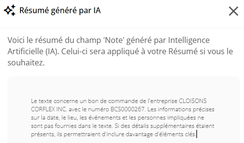 Exploitez également l’option d’Intelligence Artificielle (IA) intégrée au champ de documentation pour obtenir un résumé interactif d’un ensemble de discussions et d’échanges d’informations chronologiques depuis le début d’une tâche pour en extraire rapidement l’essence et l’objectif central.